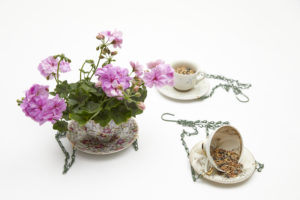 Pelargonium 2022, DIY, blomstrende fuglemater av tekopper (6/7)